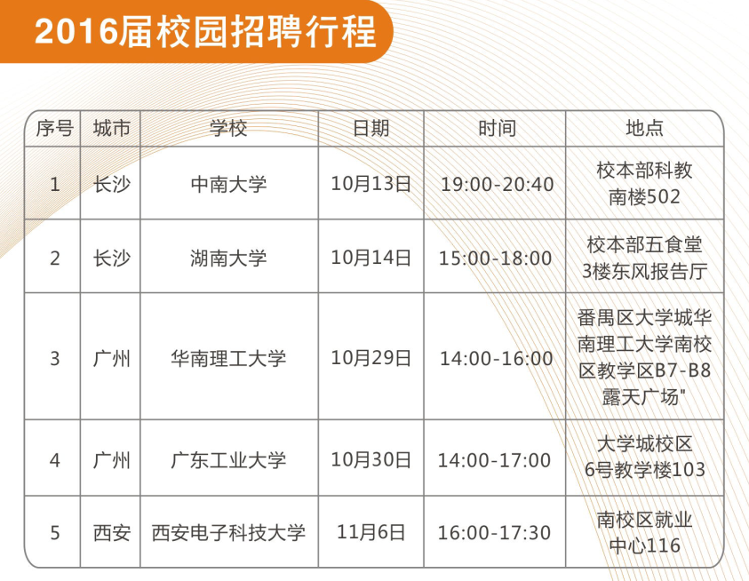 14日下午招聘组将奔赴湖南大学进行第二站的宣讲,非常感谢招聘组工作人员的辛勤工作!以下是UG环球视讯ug校园招聘的行程,敬请期待!