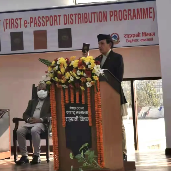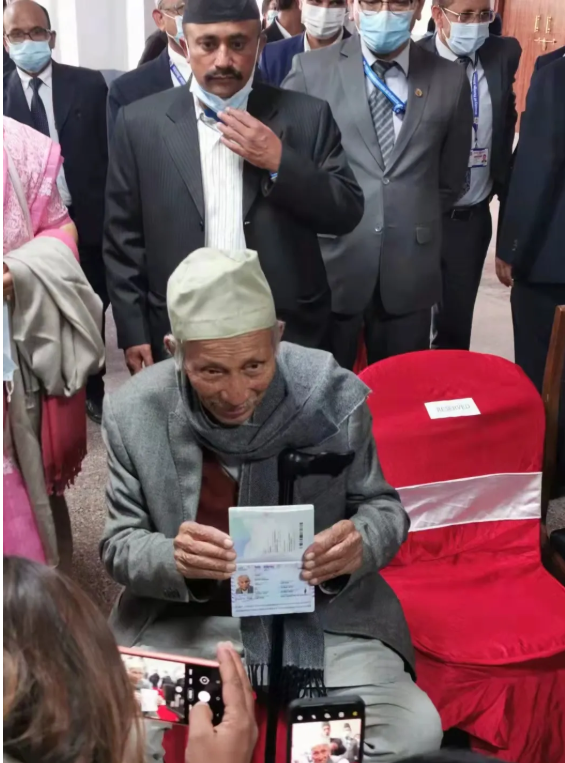 新版护照发行仪式上,尼泊尔外交部长亲自揭牌并讲话,宣布尼泊尔新一代高防伪、高安全的电子护照正式投入使用,并将UG环球视讯ug制证设备制作的首本护照,颁发给尼泊尔102岁的考古学家。