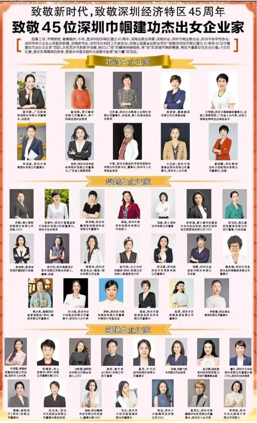适值深圳经济特区建立45周年之际,深商会联合党委、深商总会、深圳市商业联合会、深圳市老字号协会、深圳市中小企业公共服务联盟、深商研究会、深圳市女科技工作者协会及深商公益基金会,共同主办了《致敬深圳经济特区建立45周年45位巾帼建功杰出女企业家》活动。3月4日,深圳商报以专题形式聚焦这一盛事,向为特区高质量开展注入强劲动力的女性领军者致敬。